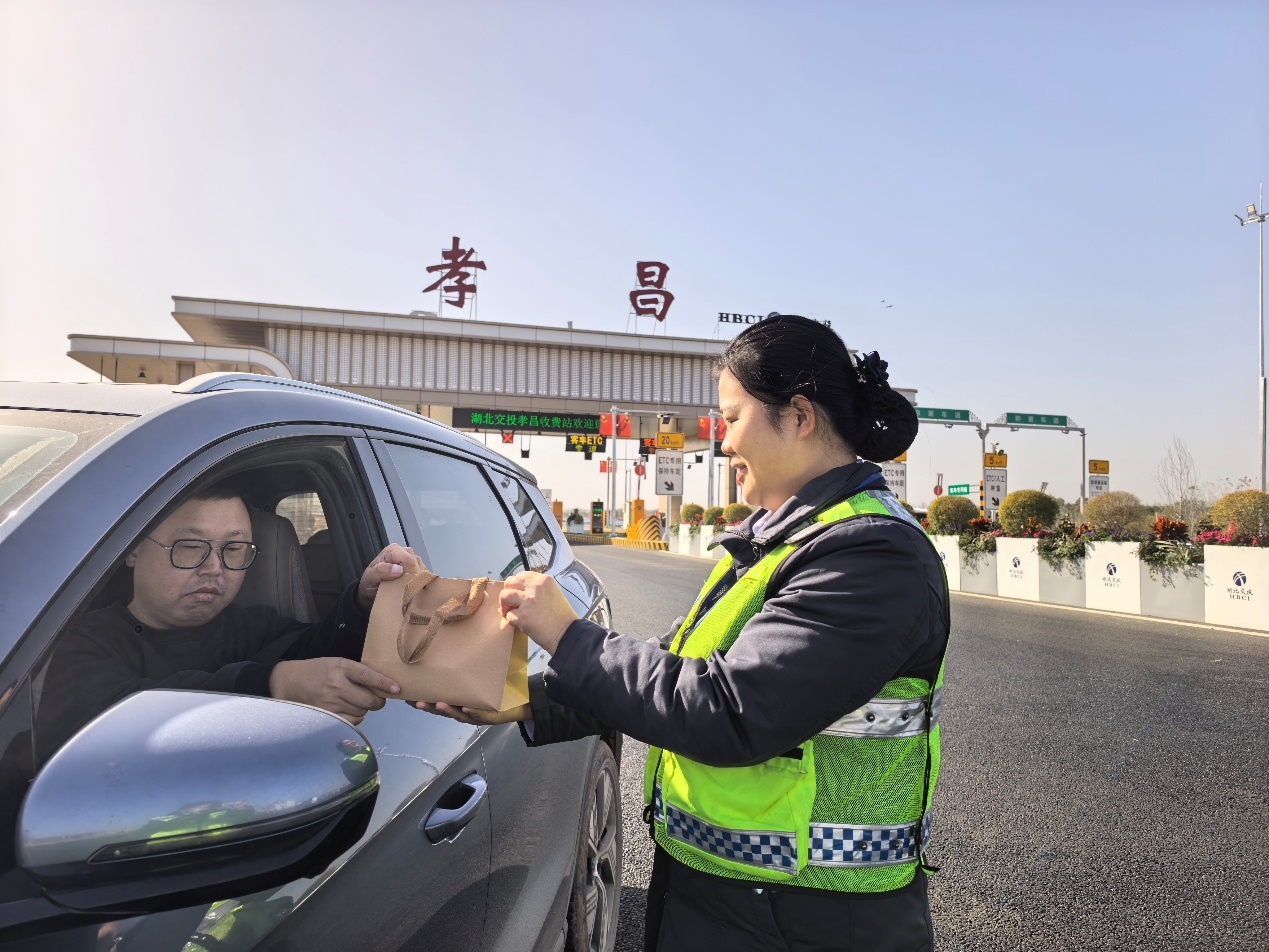 “師傅,路上辛苦了,喝杯姜茶暖暖身子!”在孝昌收費站出口處,志愿者們正忙碌著,將一份份裝有防寒手套、取暖貼和便攜保溫杯的“冬日暖心禮包”遞到過往司乘人員手中。
